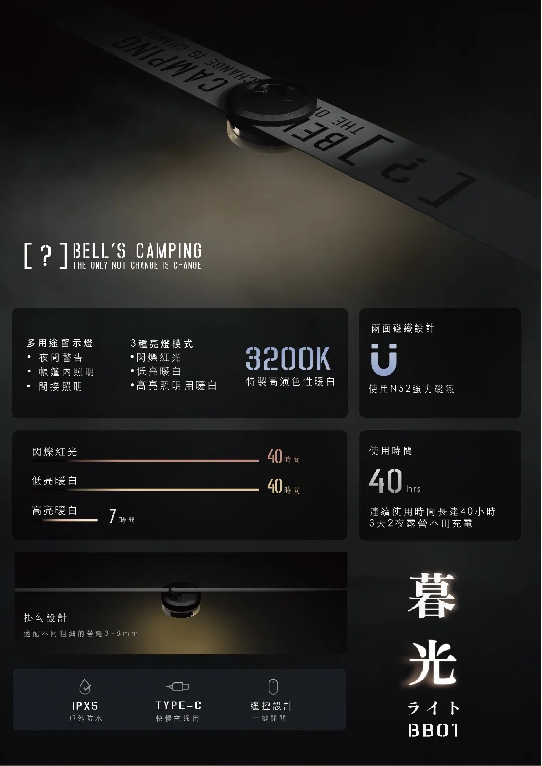 暮光 BB01 不僅是營繩警示燈,更是一款可因應不同露營情境靈活運用的多用途照明設備。