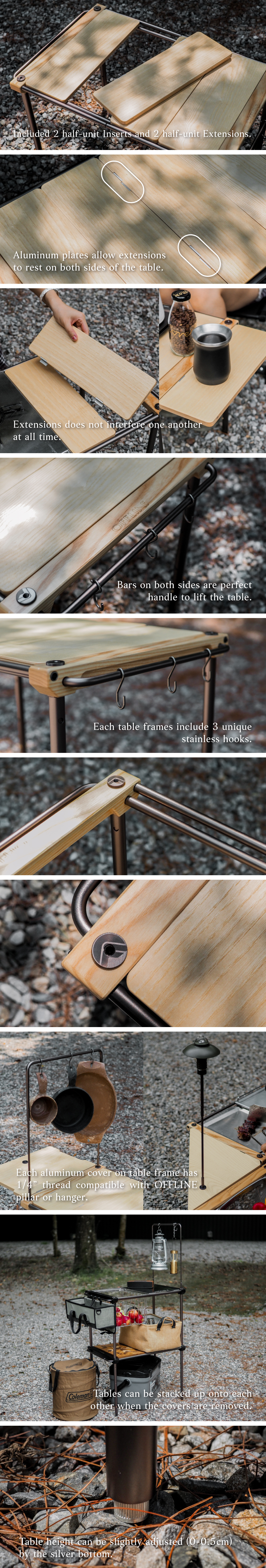 OFFLINE table is ideal not only for outdoor but also indoor uses. It can stack up onto or link to each other for multiple functions. With various IGT accessories, you can freely create your own user style. Fast and simple setup provides an incredible experience. Finally, the materials and details of the product express clearly the brand’s industrial aesthetic.